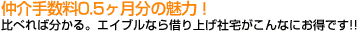 | これまで家賃の1ヶ月分を仲介手数料としてお支払いしてきた借主様が、今後、私たちエイブルにお任せいただいた場合、借上げ社宅費用等の年間経費の大幅な削減が可能です。例えば、年間100件の社宅契約が可能で、賃料の月額平均が15万円だとしますと、消費税込みで「787万5000円」のコストダウンを図ることができます。 |